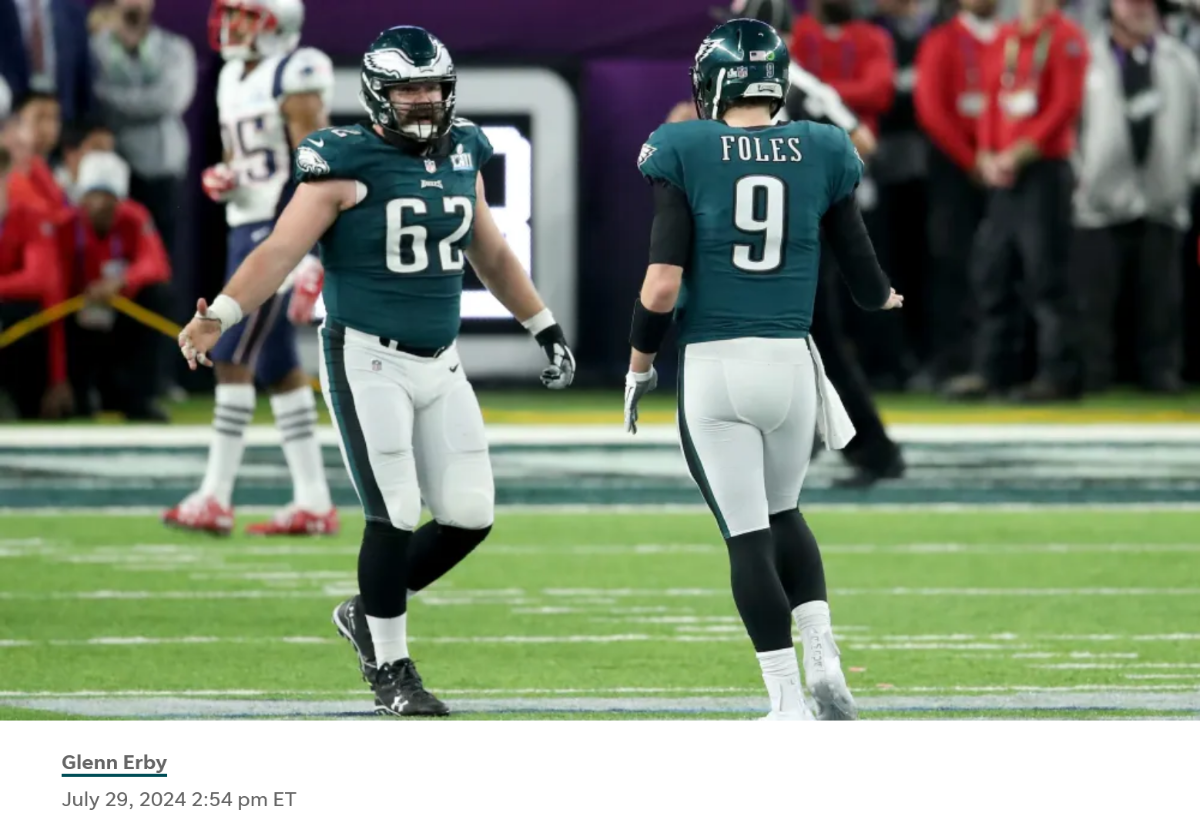 Posted July 30, 20241 yr https://theeagleswire.usatoday.com/2024/07/29/philadelphia-eagles-news-josh-sweat-jersey-number-nine-nick-foles-retired/ Did the Eagles unofficially retire the No. 9 jersey? The Philadelphia Eagles have one of the NFL’s most storied franchises, but the organization has only retired nine jersey numbers over the years. 5: Donovan McNabb 15: Steve Van Buren 20: Brian Dawkins 40: Tom Brookshier 44: Pete Retzlaff 60: Chuck Bednarik 70: Al Wistert 92: Reggie White 99: Jerome Brown Jason Kelce’s No. 62 and Fletcher Cox’s No. 91 jerseys will almost certainly join the growing list, but what about the No. 9 jersey worn by Super Bowl-winning quarterback Nick Foles? Foles, 30, had a postseason record of 4-1 during his final two years in Philadelphia, including winning MVP of Super Bowl LII. In place of an injured Carson Wentz, Foles went 6-2 in the regular season in his final two years in Philadelphia, leading the Eagles to two playoff berths. Fast forward to 2024, and defensive end Josh Sweat switched jersey numbers from 94 to 19. After Monday’s practice, Sweat told the media that he wanted 15 (Steve Van Buren). Still, that number is retired, and without stating as such, the pass rusher made it seem as if No. 9 wasn’t available either, unofficially. Sweat wore the No. 9 at Oscar F. Smith High School in Chesapeake, Virginia, and during his tenure at Florida State. Whether he was joking or not, Sweat insinuated that the number was retired. Nick Foles played 11 seasons for six teams, including the Eagles and Bears. Foles has passed for 14,227 yards and 82 touchdowns over his career, earning one Pro Bowl nomination, the Super Bowl MVP, and the Lombardi Trophy.