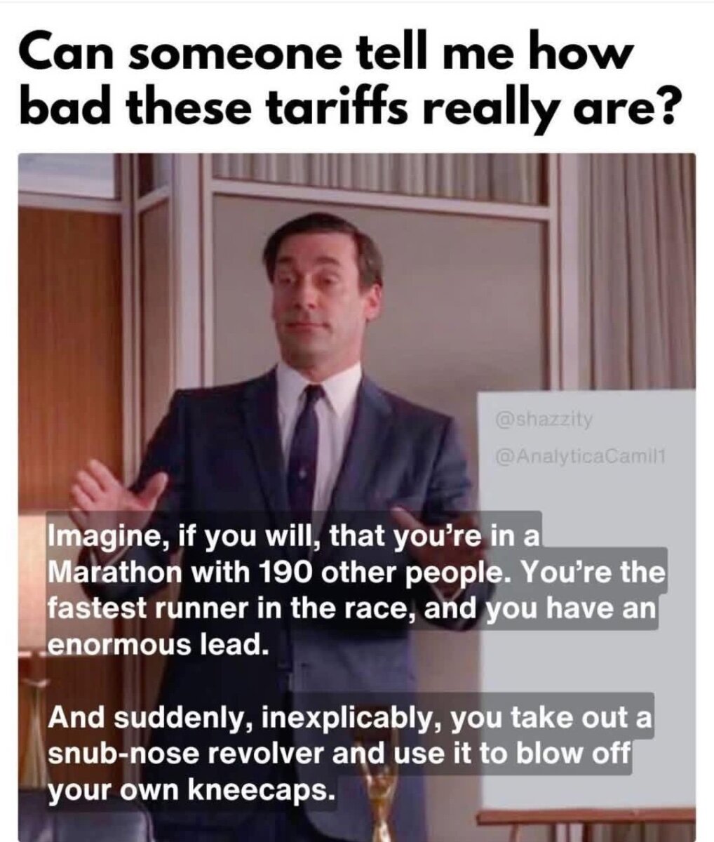 April 5, 2025Apr 5 3 hours ago, lynched1 said: Tell me in one meme that you don't understand how a global economy works You can always identity the MAGA memes because they exist for a 3rd grade audience. They require zero critical thinking because MAGA can't think critically.