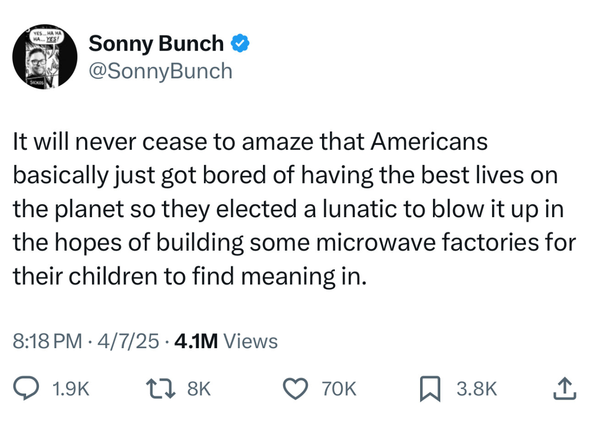 April 9, 2025Apr 9 31 minutes ago, DEagle7 said: I'm guessing Stephen Miller or some other dumb a-hole just tweeted about Singapore huh? I'm guessing this is how your thought process works, so you assume everyone else's works the same. Answer to your question: no.