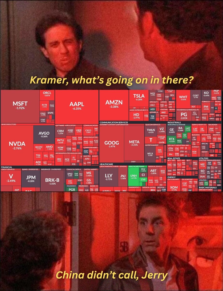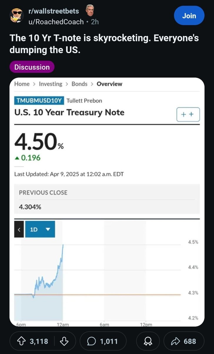 April 9, 2025Apr 9 China just opened up 84% tariffs on the US in response. Also it seems like Xi just said China will never back down and is basically willing to burn it all down before he gives into cheeto dust.