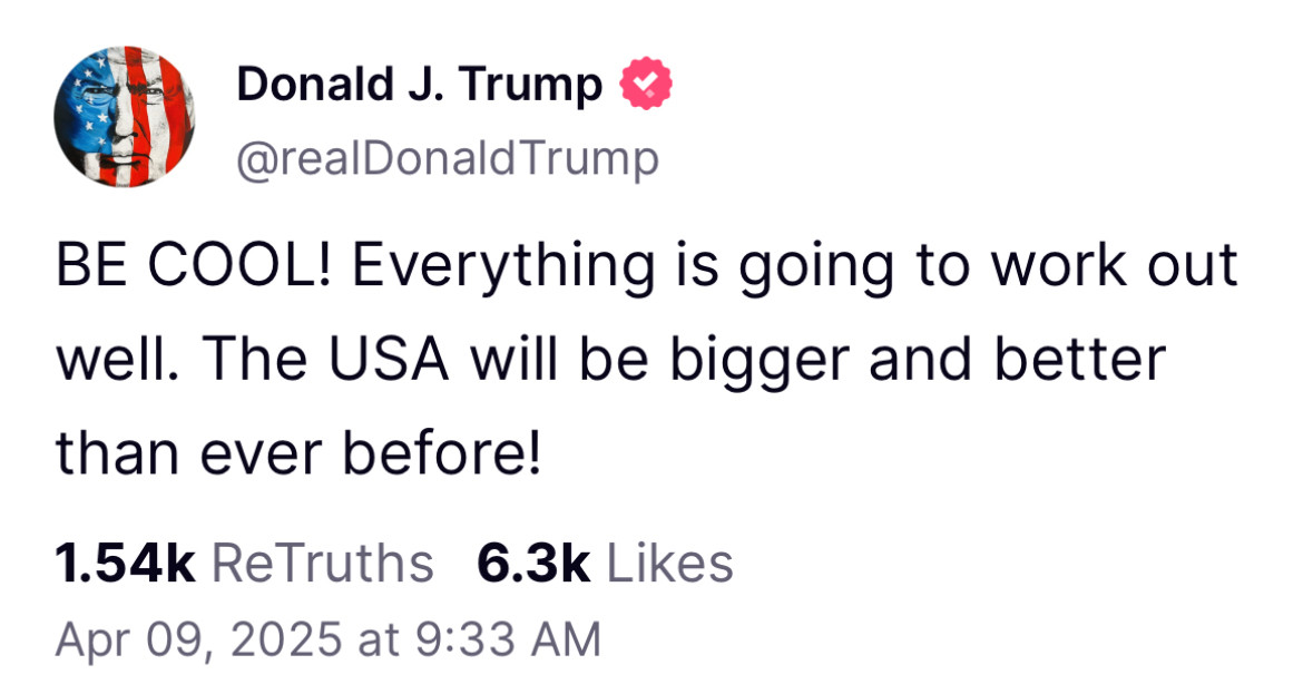 April 9, 2025Apr 9 1 hour ago, The_Omega said: Democrats are big mad about the tariff pause lol. Can somebody let us know when the deal happens?