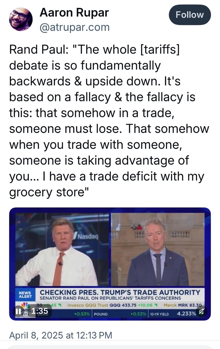 April 10, 2025Apr 10 11 minutes ago, Dave Moss said: I have a trade deficit with Starbucks Rand is real confused why the incompetent moron he's been falling in line for is suddenly acting like an incompetent moron.