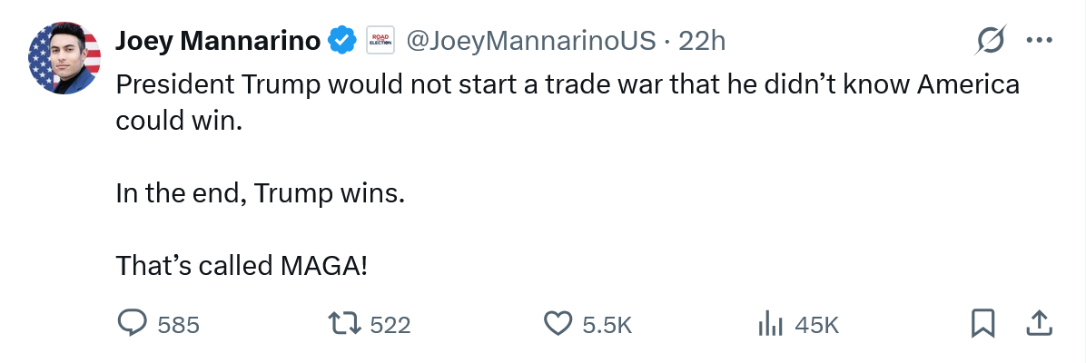 April 10, 2025Apr 10 19 hours ago, pisceschica said: oh 💩 El Trumpo with another tariff increase The thing that makes me so sad is reading the comments on this video. The number of people who have no concept of basic math is alarming.