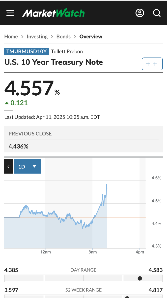April 11, 2025Apr 11 2 minutes ago, barho said: Hey, Trump, the 10-year is now higher. Now what you F’ing dope?! Has a trade war ever been lost in less than a week?