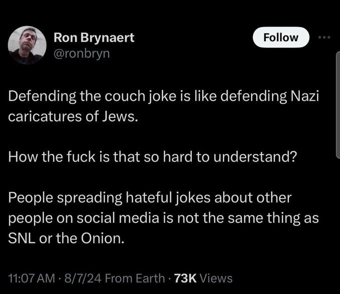 August 7, 20241 yr 30 minutes ago, Toastrel said: turdflakes "It's like the holocaust when they make fun of me!" The couch joke doesn't equate to the depiction in that post, IMO. It's more of a joke, but like many things that get debunked, people like to pretend it really happened. It is kind of odd, though that a guy that said this: *Disclaimer --- I'm only posting the tweet for the video, not the opinion of the poster: Wouldn't referencing the couch as a joke be under the misinformation category in an election campaign gathering? Just asking ...