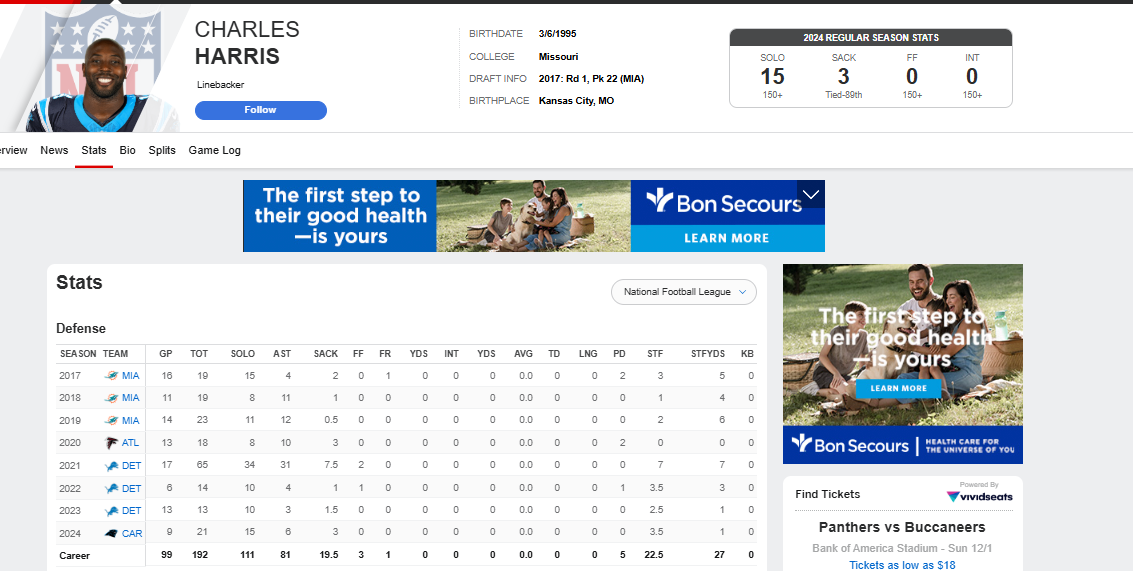 November 26, 2024Nov 26 Former first round bust for Miami. Had one productive season with 7.5 sacks with the Lions. Pretty meh.