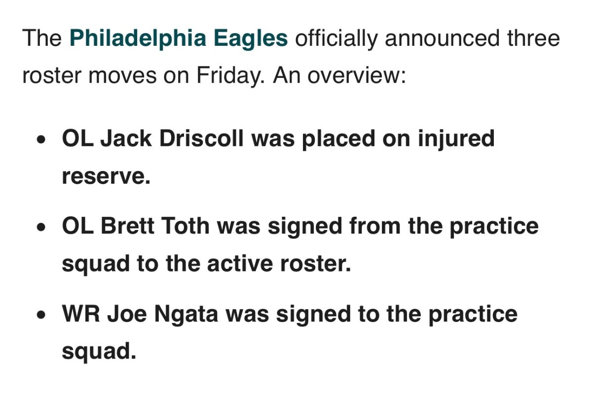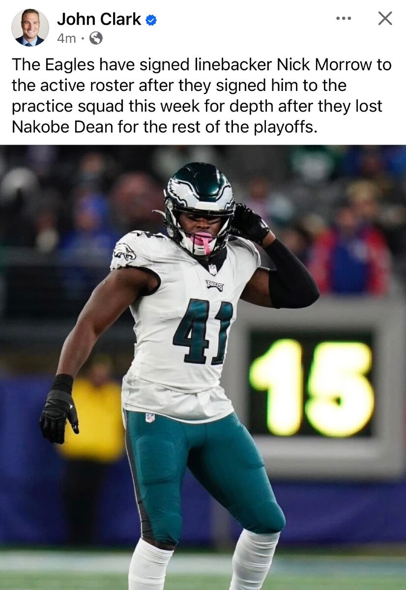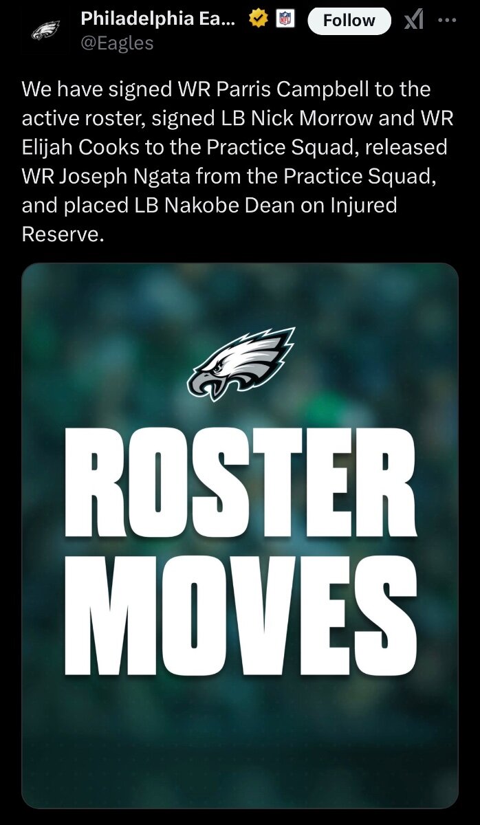 January 14Jan 14 Author Dean to IR Campbell signed to active roster Morrow and Cooks signed to practice squad. Ngata released from practice squad. https://x.com/Eagles/status/1879281613798088739