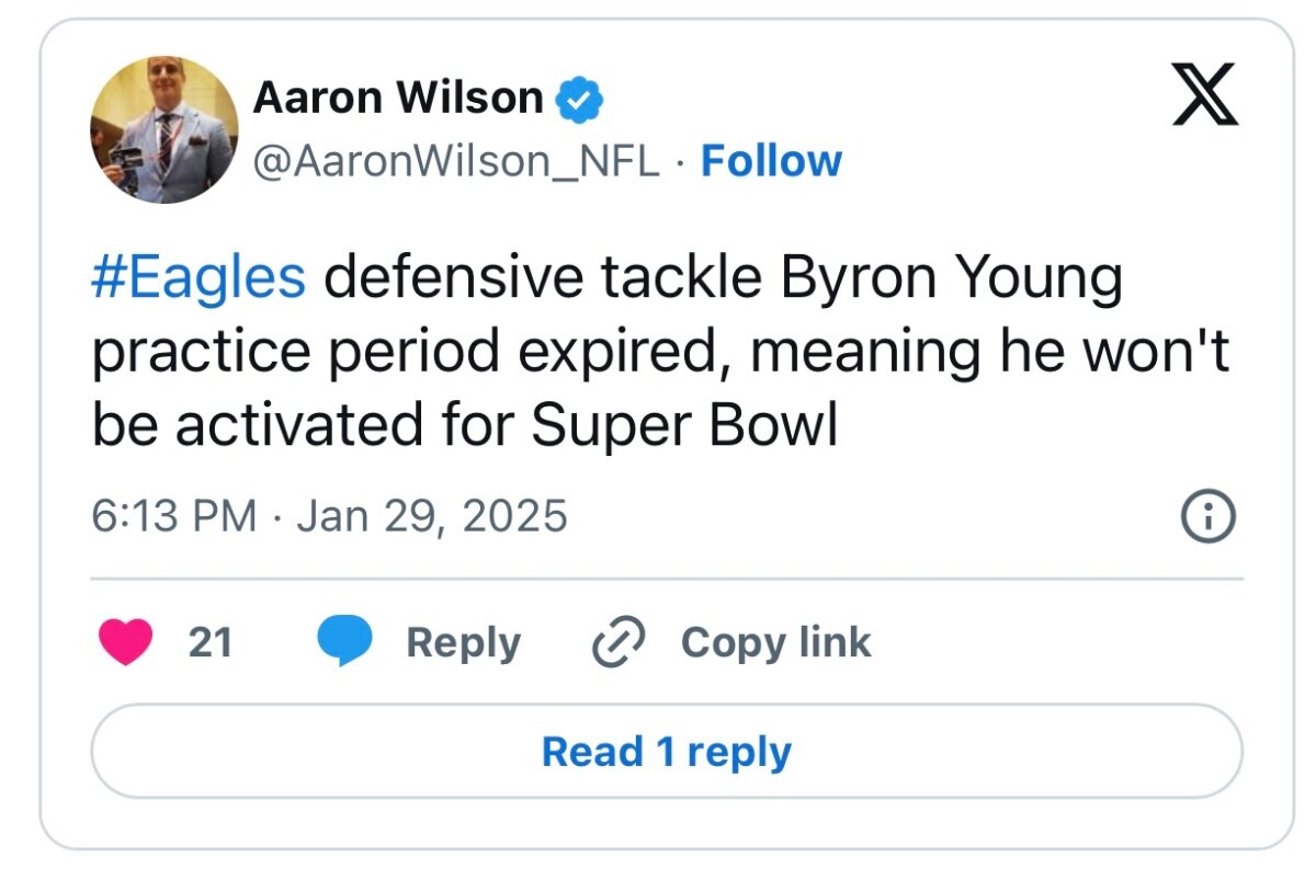 February 9Feb 9 Author 4 roster moves made in advance of tomorrow’s game: BG activated Nick Gates placed on IR FB Khari Blasingame elevated from practice squad LB Nicholas Morrow elevated from practice squad GO BIRDS!! 🦅 https://theeagleswire.usatoday.com/lists/philadelphia-eagles-roster-moves-chiefs-super-bowl-lix-brandon-graham-nicholas-morrow/