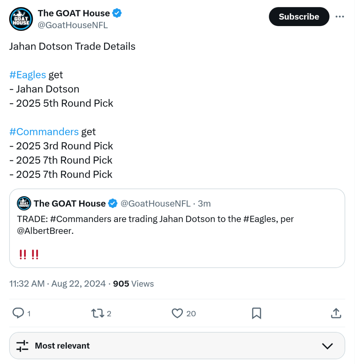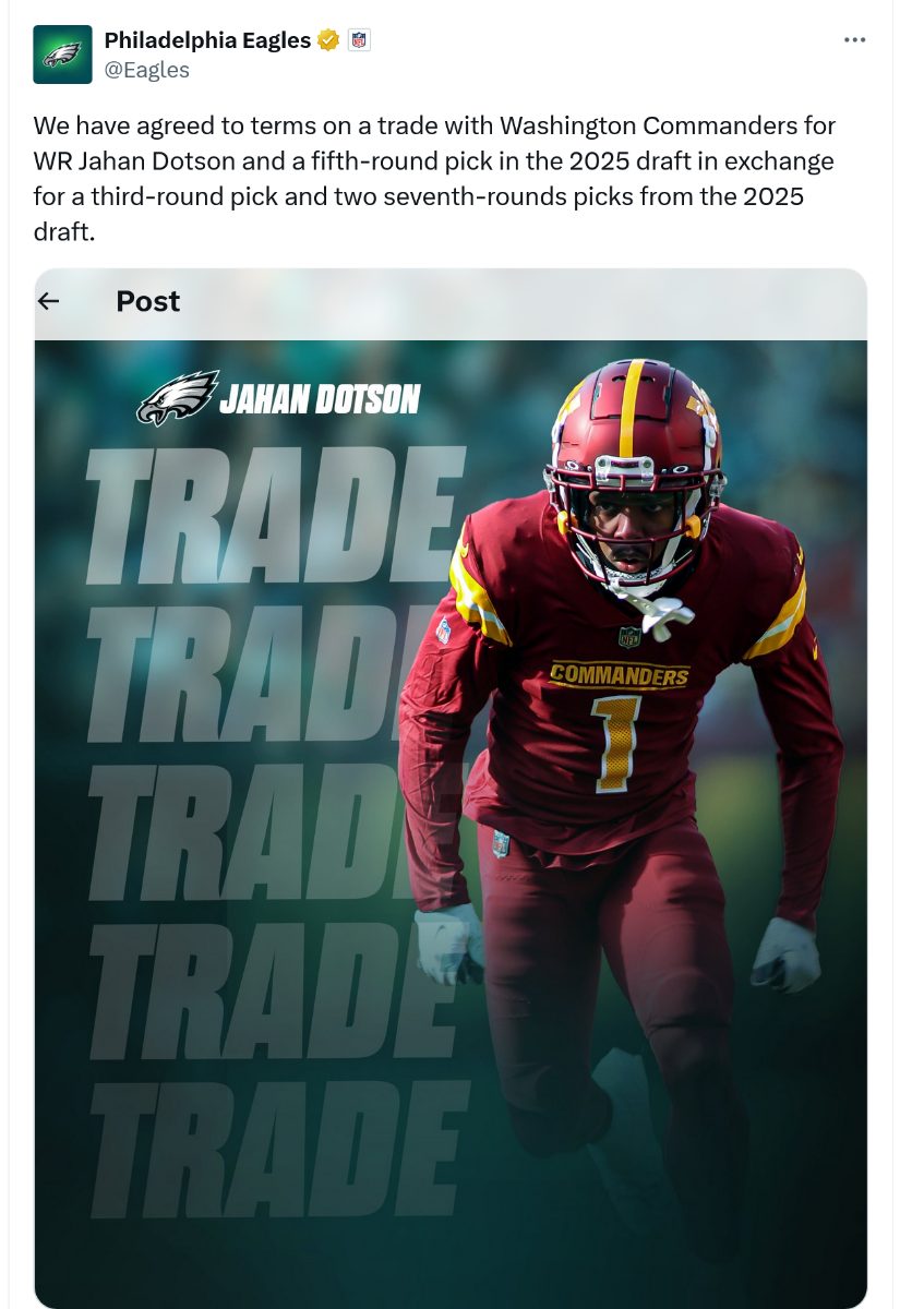 August 22, 20241 yr It feels a little desperate. Eagles need WR depth and a slot. Dotson has a lot to prove but he's still young. The Eagles didn't have to give up much. Just a drop from a 3rd Round Pick to the 5th, and a couple of 7th Rounders. I can't hate the trade.