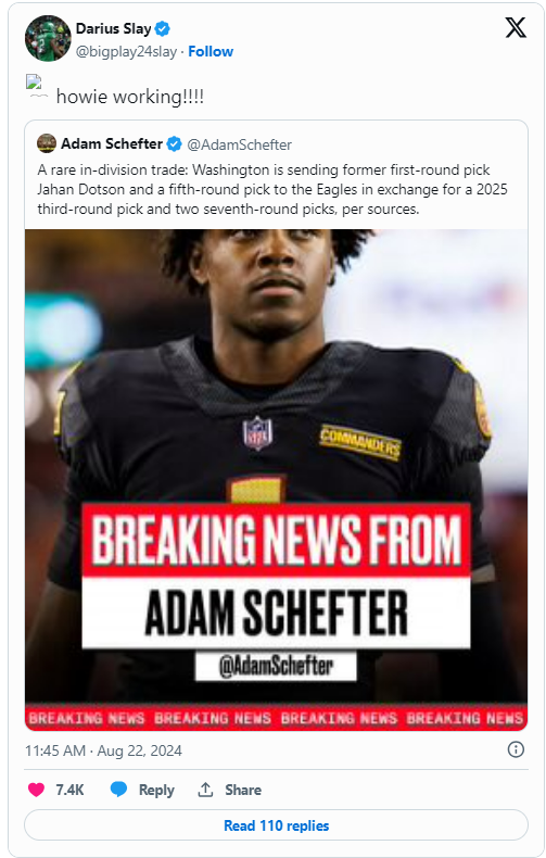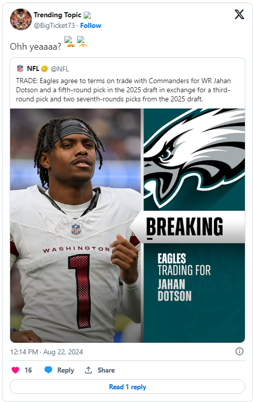 Posted August 23, 20241 yr Jahan Dotson trade reactions: "The Eagles now have the best WR trio in the NFL” Philly’s receiving corps is suddenly looking a lot better. By Alexis Chassen@Lovelybuckeye Aug 22, 2024, 2:00pm EDT The Eagles lost two wide receivers to concussions last week against the Patriots — Johnny Wilson during joint practice, and John Ross during the preseason game — and it became increasingly obvious that the WR3 spot still wasn’t completely addressed. So, Howie Roseman does what he does best, and was able to bring in some depth via inter-division trade with the Commanders for Jahan Dotson. It was a no-brainer for Roseman, who is acutely tuned in to potential additions, and was able to get a first-round player with two years left on his rookie deal. Plus, the Eagles now have a very solid WR3 option, and Dotson played with Saquon Barkley at Penn State and will assuredly get his friend up to speed in Philly. As much as it was a no-brainer for Philly, Washington’s decision to make the trade to an NFC East rival — regardless of reported tensions between Dotson and the new team management — was a bit surprising. They handed the Eagles a starting lineup of skill players that includes A.J. Brown, DeVonta Smith, Dotson, Saquon Barkley, and Dallas Goedert. Great for Eagles fans, not so much for Commanders fans. A few of Dotson’s new teammates reacted to the trade online, along with other players throughout the league and analysts. https://www.bleedinggreennation.com/2024/8/22/24226147/jahan-dotson-trade-reactions-nfl-news-eagles-commanders-wide-receiver-penn-state-philadelphia-wr