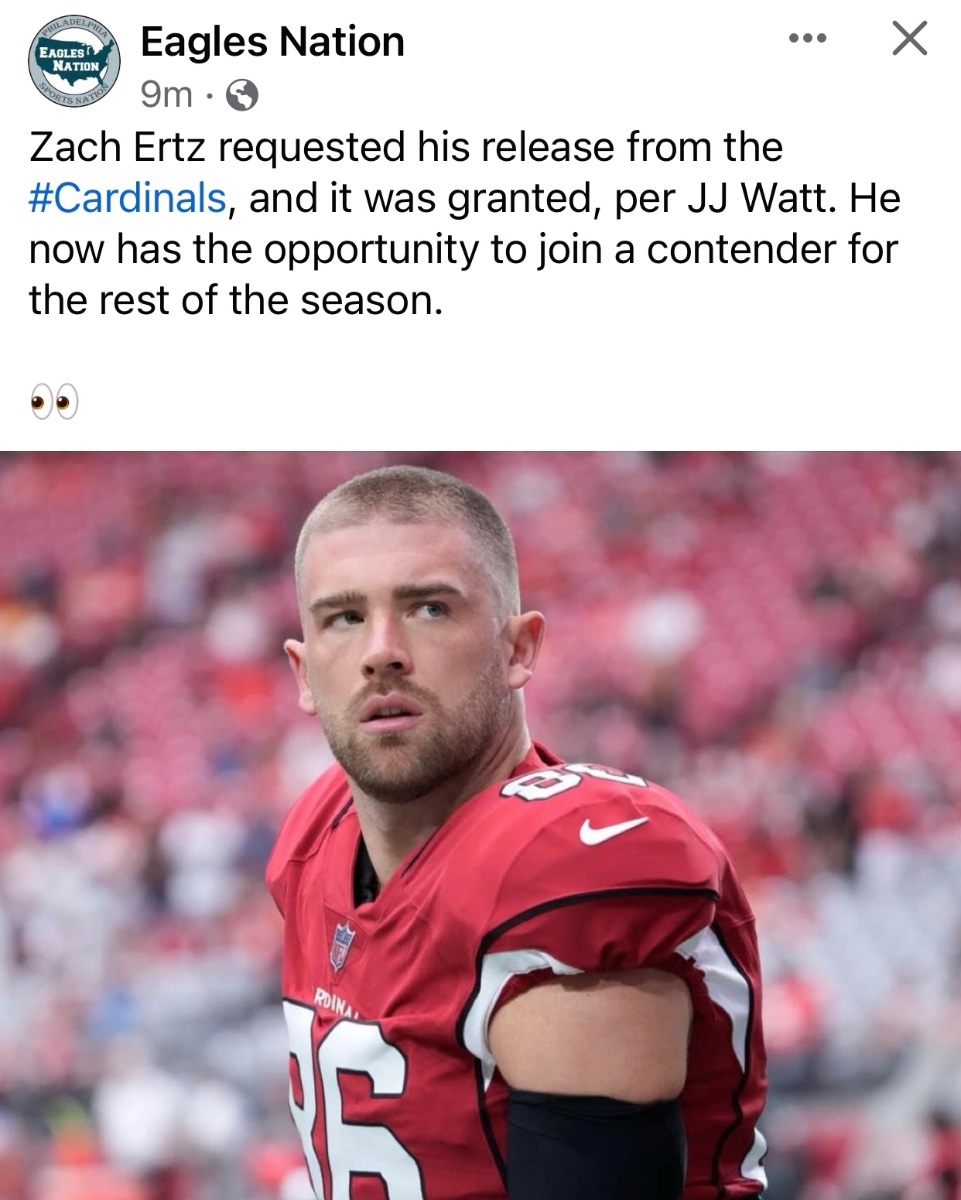 November 30, 20231 yr 20 minutes ago, EazyEaglez said: Ertz getting released from the Cardinals. https://www.si.com/nfl/cardinals/news/arizona-cardinals-release-zach-ertz-per-request Hmm