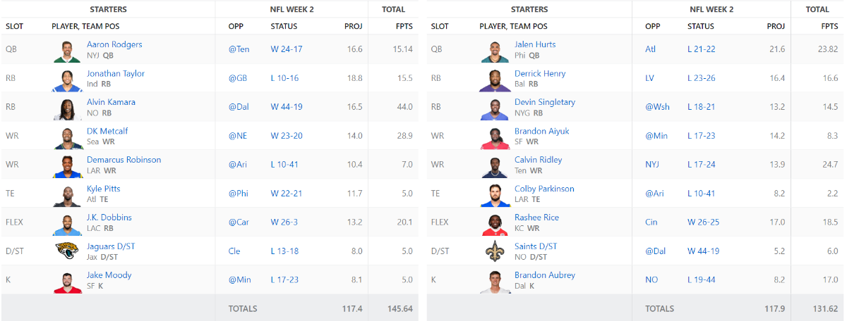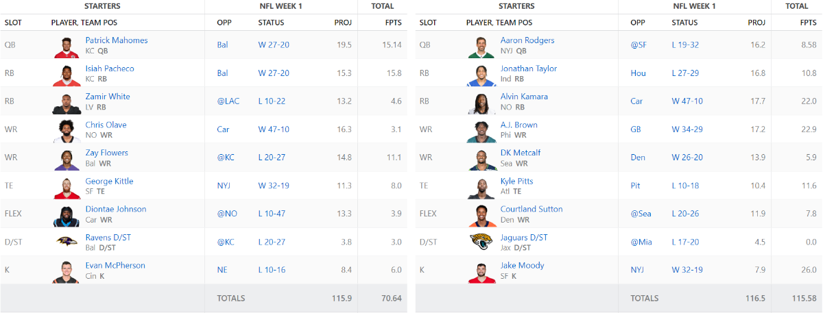 September 9, 20241 yr Author well, so far in week 1, i'm up by 21 points and still have rogers and moody going tonight while my opponent has kittle going.