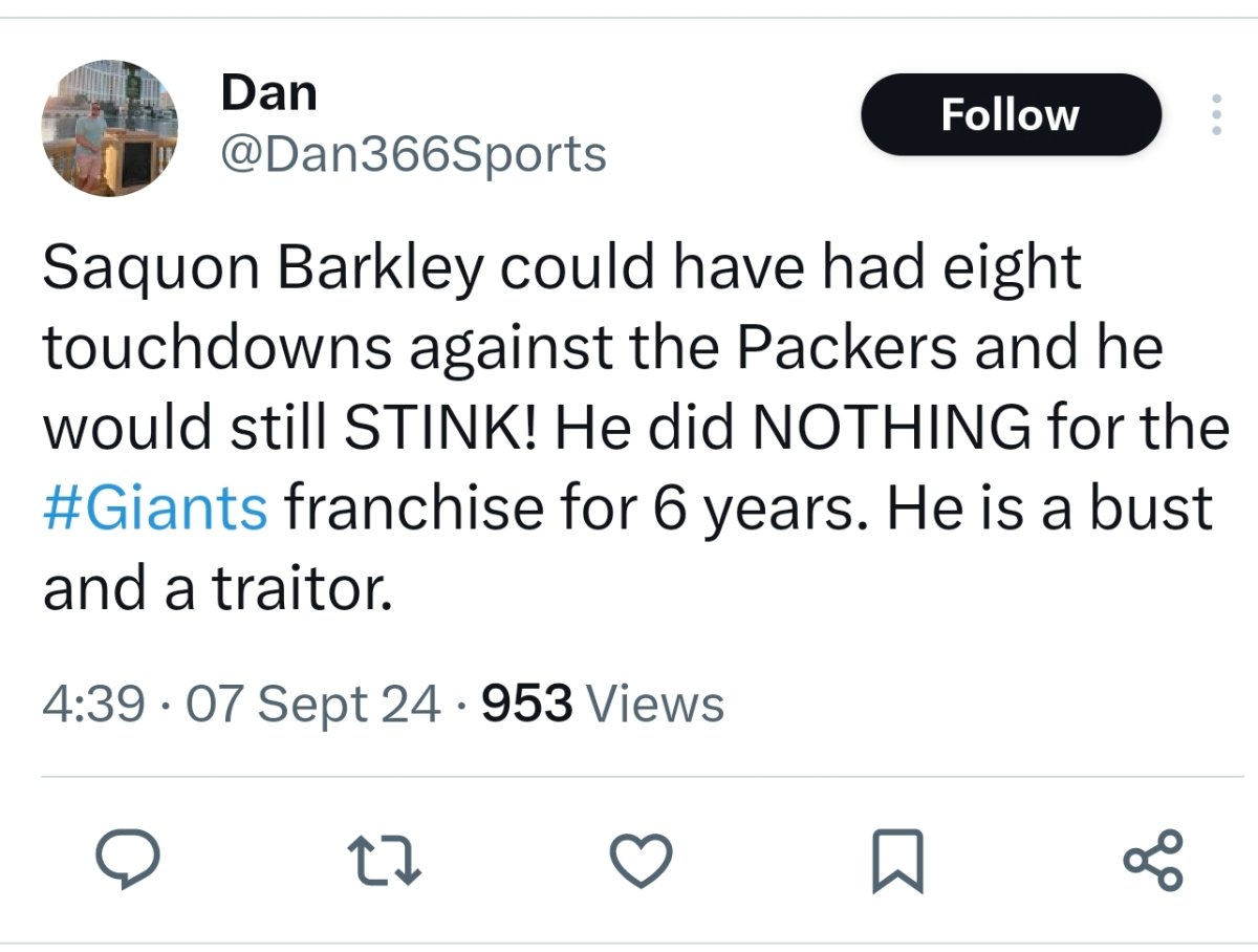 September 7, 20241 yr 57 minutes ago, Cochis_Calhoun said: The lad Dan there took Saquon's performance and the absolute roasting he got for that tweet really well btw Someone’s a little bit sore! 😂