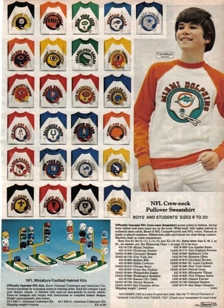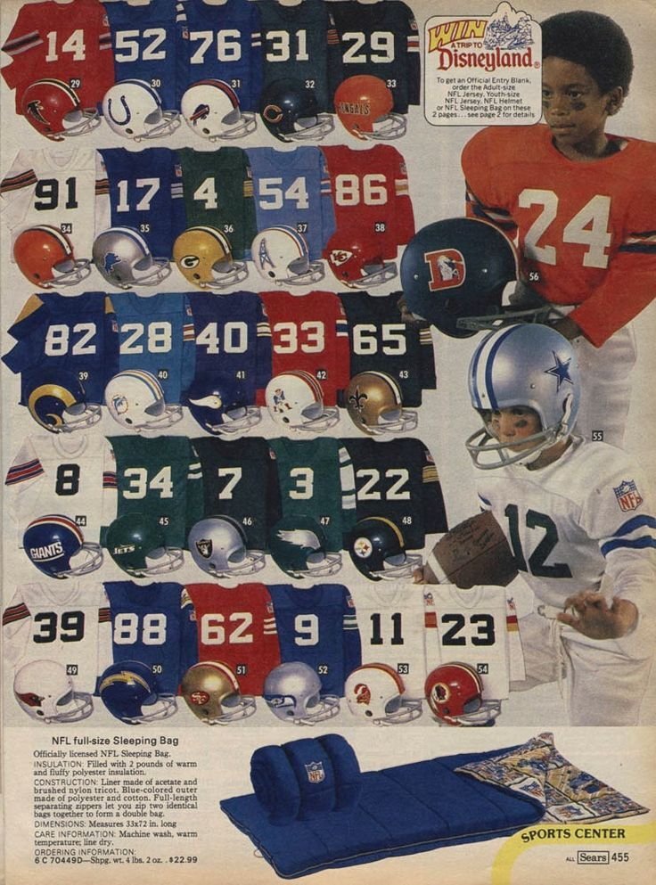 September 12, 20241 yr Author 2 minutes ago, Alpha_TATEr said: first jerseys i got were from sears when i was a kid, they werent official< but thats what a kid could get back then. i had wilbert, carmichael and jaws. ironically, the first real jersey i ever got was mike quick. The Sears catalog is basically why I'm an Eagles fan today. Sometime between 1974 and 1976 (when I was between 5 and 7), while looking at the toy section in the back of the catalog, I discovered the NFL kids uniforms and of all 26 helmets, it was the green one with the cool looking wings that I liked the most. From there, it just grew into me becoming a diehard Eagles fan (living in a Redskin household about 10 miles from RFK Stadium). This isn't the right time frame for what I'd have seen as a kid (the Bucs and Seahawks are present and the Jets helmet is green, making this ad post-1977) but it's similar to what I'd have stared at for hours: Spoiler This is could also be something that I'd have seen back in the day and likely is exactly what I saw, it's either 1974 or 1975, since the Eagles helmet is 1974-era Kelly Green, the Jets helmet is white and both the Bucs and Seahawks aren't present: Spoiler I also really liked the Chargers helmet, so as a little kid, I had 2 favorite teams. One NFC one AFC. By the time I was around 10 (1979), I decided that having two favorite teams was stupid and dropped the Chargers. I really didn't follow them anyway. I just liked the helmet.