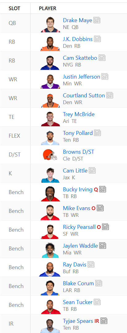 September 30Sep 30 What I really need is a receiver to replace Nabors. I started out thinking I was in great shape at WR with Nabors and AJ Brown as my starters. They have helped with my 1 and 3 record. I have Egbuka replacing Brown because Im just done with Brown until something changes with the Eagles offense. Going to start Pittman as my other WR this week. I have Evans on IR and DK on the bye. Not much out their in terms of WR on the waiver wire. Dobbs is probably the best of what's there.