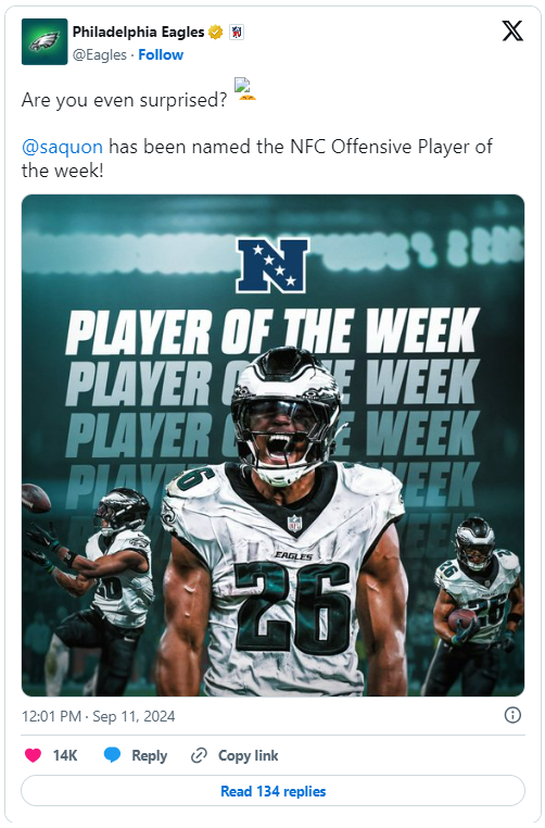 Posted September 12, 20241 yr Eagles' Saquon Barkley gets NFC Offensive Player of the Week honors Touchdown count: Saquon Barkley, 3. The New York Giants, 0. By Nick Tricome PhillyVoice Staff Kirby Lee/Imagn Images Saquon Barkley had an Eagles debut to remember. Saquon Barkley was the star of the show in the Eagles' season-opening win over the Packers down in Brazil, and on Wednesday, he got league recognition for it. The Eagles' new running back received NFC Offensive Player of the Week honors for his impressive debut, the NFL announced after Week 1's wrap, continuing to get the big free-agent signee's tenure in Philly off on the right foot. Barkley racked up 132 total yards during last Friday night's opener in São Paulo, rushing for 109 yards on the ground while scoring three touchdowns – which hasn't been done by a debuting Eagle since Terrell Owens in 2004. He scored his first on a well-executed wheel route and loft from Jalen Hurts into the end zone, which got the Eagles on the board and their offense finally going after a sloppy first two drives that ended in turnovers. Then he powered through on the ground for his next two, which helped keep the Eagles ahead of Green Bay. "You gotta give credit to the offensive line," Barkley said afterward. "It starts with the offensive line and Jalen making the right reads to put us in the right positions. The O-line is setting me up, making me look better than I actually am, and it doesn't hurt to have Dallas Goedert, A.J. Brown, and DeVonta Smith, you know? "On the scouting report I'm probably not even in the top 3 you gotta worry about, so it makes my job a lot easier, and [offensive coordinator Kellen Moore] does a really good job to put us in a position to be special. I'm just happy to be here and start it off right." So far, so good. The Eagles signed Barkley in the offseason to a three-year, $37.75 million contract in a major splash of a free-agent deal, which was preceded by negotiations between Barkley and his former team the New York Giants that, as Hard Knocks revealed, were never even close to being taken seriously by Giants GM Joe Schoen. A couple of days after Barkley debuted with three touchdowns for Philly, the Giants took the field for Week 1 and couldn't score a single one. https://www.phillyvoice.com/eagles-news-saquon-barkley-nfc-offensive-player-of-the-week-brazil-packers-nfl/