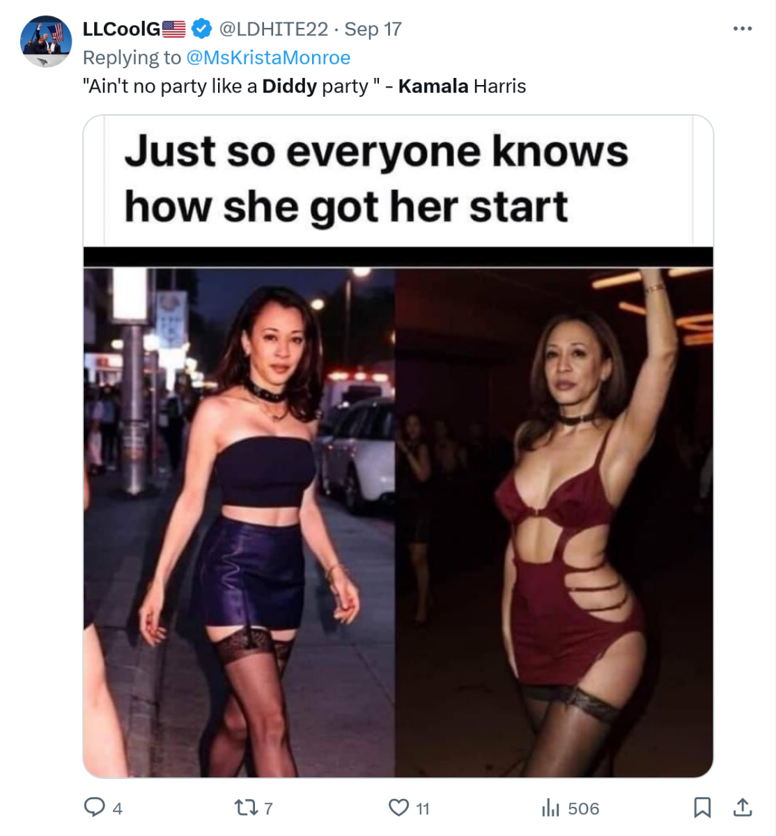 September 21, 20241 yr 🫢 Donald Trump Shares Fake Image of Kamala Harris at a Diddy ‘Freak Off’ However, in the real photo, Harris was not posing with Diddy, but with her ex Montel Williams. https://www.billboard.com/music/music-news/donald-trump-shares-fake-image-kamala-harris-diddy-freak-off-party-1235781035/