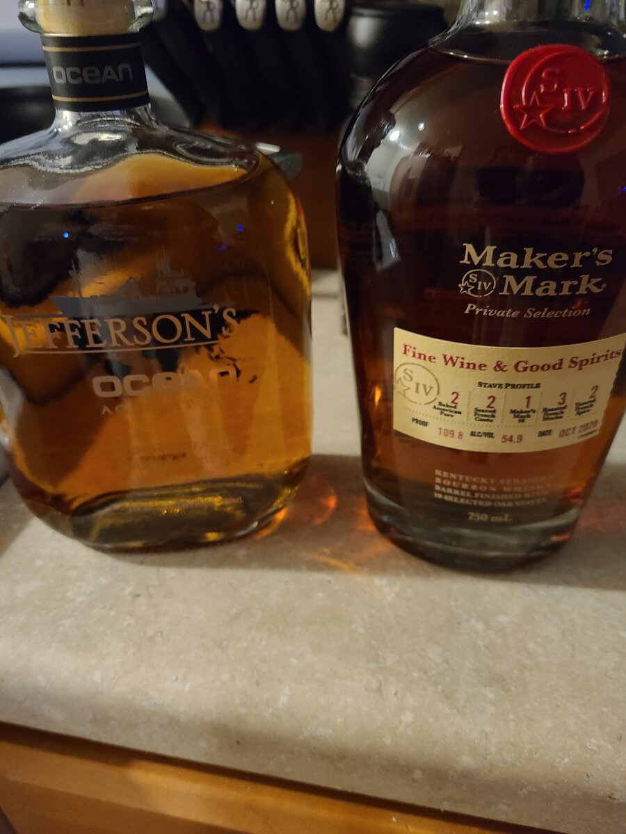 March 29, 20214 yr These are my 2 newest. Only had a taste of both. The jeffersons is very interesting and I need to try another glass to really nail down the taste. A little sweet, nothing stood out too much but I definitely tasted the brinyness of it being at sea. The makers has a ton of different flavors,but I was already pretty buzzed when I tried it and couldn't get a great read on it.