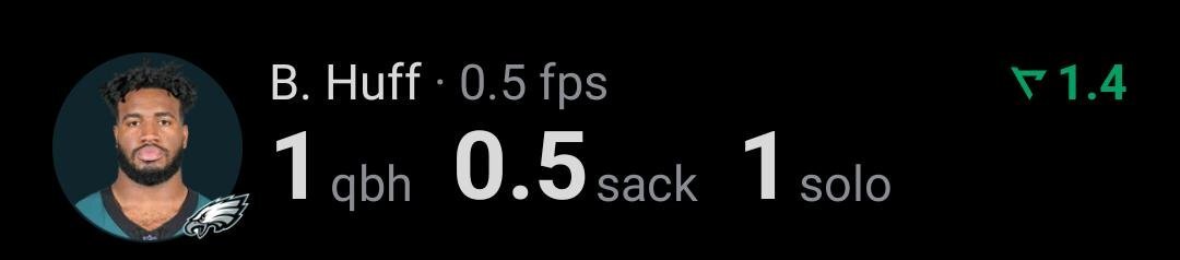 October 14, 2024Oct 14 7 hours ago, Godfather said: Huff is going to get a sack today Close... 1/2 sack