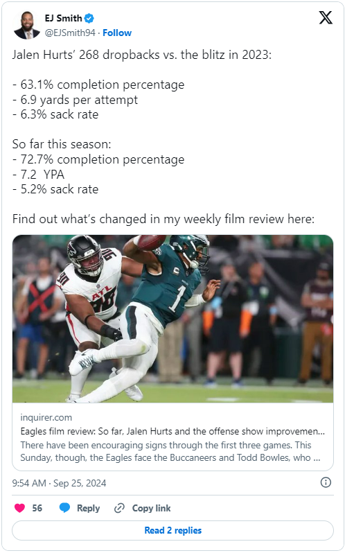 Posted September 29, 20241 yr Eagles at Buccaneers: Five matchups to watch Will Jalen Hurts have an answer for Todd Bowles' heavy blitzes this time? By Jimmy Kempski PhillyVoice Staff Kim Klement Neitzel/Imagn Images Can the Eagles' pass rush get to Baker Mayfield? After facing the Atlanta Falcons Week 2 and the New Orleans Saints Week 3, the Philadelphia Eagles will face their third consecutive NFC South opponent Week 4 in the Tampa Bay Buccaneers, who they have already played four times since the start of the 2021 season. Here are our five matchups to watch. 1) Jalen Hurts vs. Todd Bowles Heading into the Eagles' playoff matchup with the Bucs last season, there was no mystery to what Todd Bowles was going to try to do to the Eagles defensively. They were going to blitz Jalen Hurts, early and often. The Eagles were wholly unprepared for it, as Hurts looked to extend plays by running out of the pocket and away from blitzes, trying to buy time for vertical routes to develop down the field before eventually throwing the ball away. As usual that season, there were no hot routes or other mechanisms to allow Hurts to beat the blitz by getting the ball out quickly. In that game, the Eagles rarely tried to run the ball, and when they did they were ineffective against the Bucs' loaded boxes. They continuously got themselves into long downs and distances, and went 0 for 11 on third and fourth down conversions. 0 for 11! "Obviously they had a pressure plan associated with stopping the run and putting a lot of stress on the protection game," Kellen Moore said on Tuesday. The Eagles' handling of the blitz was a major offseason priority, and so far they've been better. "I know Jalen has really played well against the blitz these last couple games, and he's worked his butt off on it," Nick Sirianni said. "And just excited about the challenge, but we know there's going to be challenges against a Todd Bowles' coached defense. Again, we have done a nice job so far, but you're only as good as your next game." Bowles has concocted good plans for Hurts even further back than last year's playoff matchup. In the playoff game following the 2021 season, for example, Bowles and his staff correctly identified that Hurts had a strong tendency to both throw and scramble to the right side of the field. To combat that, Bowles mush-rushed from Hurts' right side, made him go left if he was going to leave the pocket, and he sought to take away Hurts' first read on the right side of the field. The result? Hurts threw wildly all over the field, missing receivers long, short, left, right, and everything in between. Interestingly, FOX's Greg Olsen revealed during the Eagles-Saints telecast that the Saints' gameplan was to force Hurts to move to his left. Hurts did make some plays when the Saints were able to accomplish that. "Obviously any quarterback that is right handed, you're naturally going to roll out at times when you get off-schedule to your right," Kellen Moore said on Tuesday. "Jalen has done a phenomenal job of continuing to build confidence and comfort level in that. I thought he had a few good examples. "This is a couple weeks in a row where not getting out-of-the-pocket, hanging in the pocket within time and when he has to scramble, he scrambles, and he found Kenny on one down the left sideline. He found Smitty on the left side. Both good examples of when he got into a scramble drill to his left, found a completion and still remained a passer. Those were bigtime plays." Here's the completion to Kenny Gainwell that Moore referenced. And the completion to DeVonta Smith: It'll be interesting to see what Bowles cooks up for Hurts on Sunday. He is a master at identifying and exploiting weaknesses. "Todd is always going to have his different flavors," Moore said. "He's going to play us, there may be some stuff that falls back on that and there may be some new components that he'll pull out and try to stress you in different ways because he knows you'll be anticipating those. He does an excellent job. "When I was at other places, we've played him multiple times and every game seems to be a different flavor. It's not necessarily whether he won or lost, it's going to be a different flavor and different challenge each and every week. We have to do a good job of having our answers and understanding our tools and the adjustments that we may or may not need to make." 2) The Eagles' run game vs. the Bucs' run defense The Bucs' defense has always hung their hat on stopping the run. Their run defense rankings since Bowles became the defensive coordinator in 2019: • 2019: 1 • 2020: 1 • 2021: 3 • 2022: 15 • 2023: 5 Of course, that doesn't mean that the Eagles can't have success in their run game. In the Eagles-Bucs Week 3 game last season, they absolutely dominated the Bucs in the run game. After the Bucs scored their first touchdown of the night with 9:22 left in the fourth quarter, the Eagles executed a 15-play drive that bled out the rest of the clock. The Bucs were so defeated that Bowles didn't even bother calling his remaining timeouts. But also, oh hey, Saquon Barkley leads the NFL in rushing. Saquon Barkley, Eagles: 351 Jordan Mason, 49ers: 324 J.K. Dobbins, Chargers: 310 Alvin Kamara, Saints: 285 Derrick Henry, Ravens: 281 The Eagles have a bunch of injured wide receivers: A.J. Brown: Missed the last two games with a hamstring injury, and missed practice on Wednesday and Thursday. DeVonta Smith: Left the Saints game with a concussion, and did not return. Missed practice on Wednesday and Thursday. Britain Covey: Placed on injured reserve on Monday. Johnny Wilson: Appeared on the injury report each of the last two games, but played in both of them. The Eagles shouldn't overthink it. Lean on the run game. 3) The Eagles' run defense vs. the Bucs' rushing offense Usually, when a team has a defensive head coach who is hellbent on stopping the run, that team is also usually built around the run game offensively. Not
