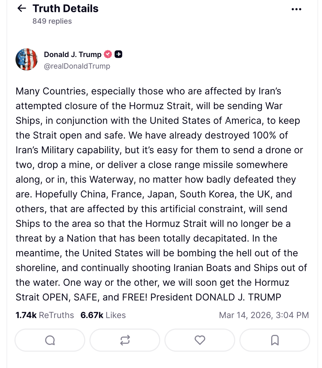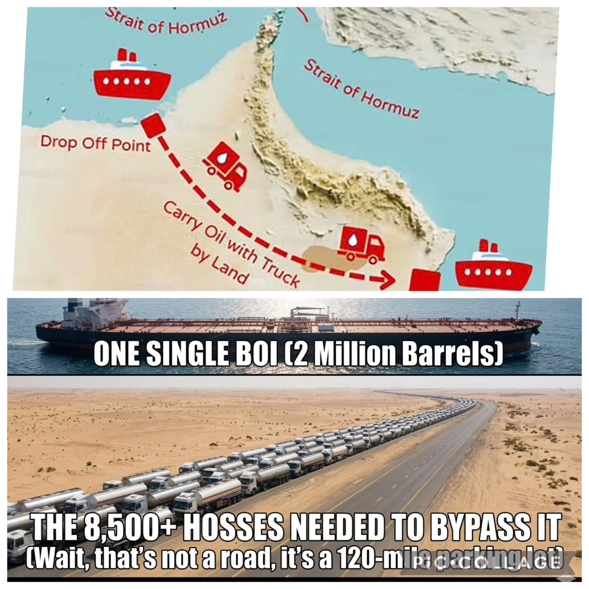 Saturday at 10:01 PM1 day Trump proposed trucking oil across the desert instead is shipping it through Strait of Hormuz? Thats not going to work.