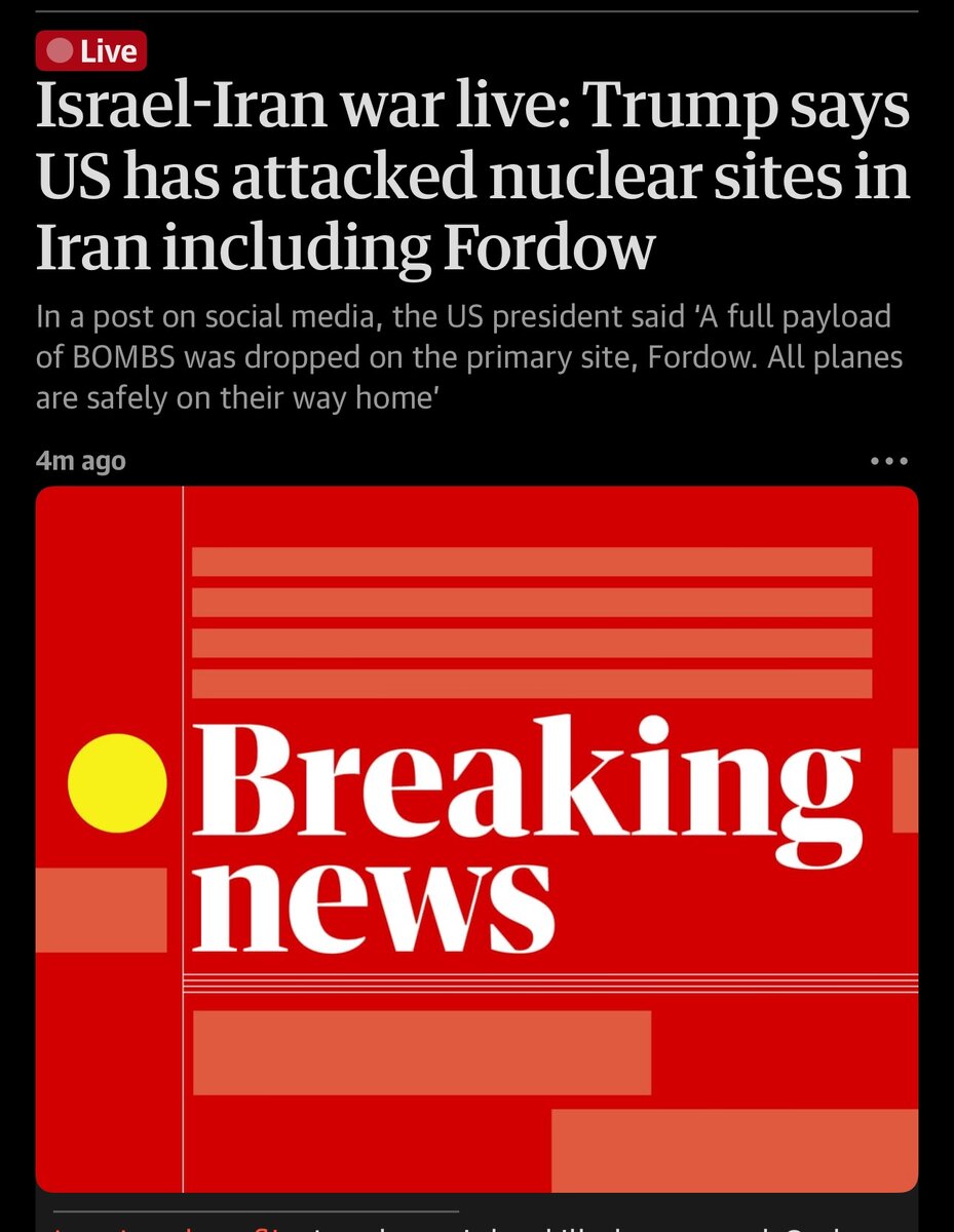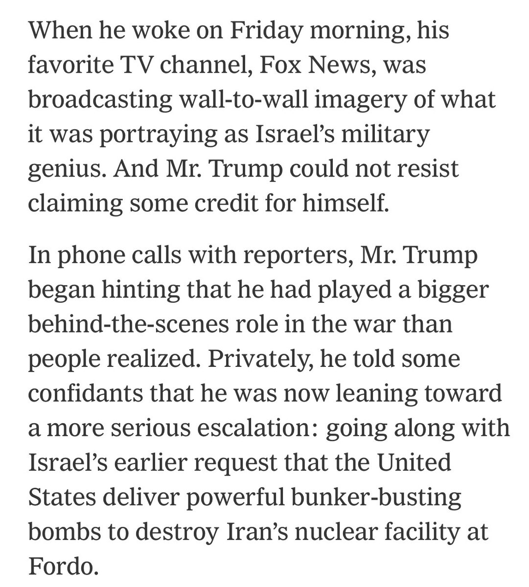 June 21Jun 21 Trumpbots: We need Trump in office because he will keep us out of forever warsAlso Trumpbots: Trump is going to bomb IranAlso delusional Trumpbots: after we bomb Iran they are going to give Trump the Nobel Peace Prize!