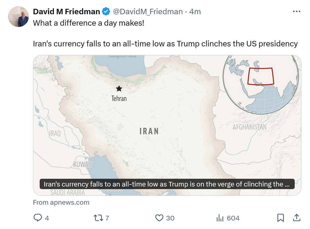 November 6, 2024Nov 6 Author Hopefully, this marks the countdown of the end of that malign regime so that the great people of Iran can reclaim their country back