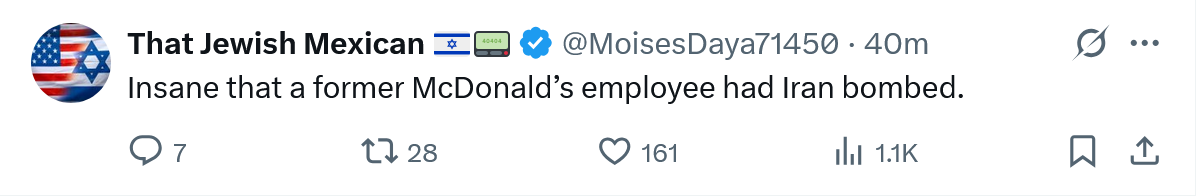 June 22Jun 22 Author 34 minutes ago, we_gotta_believe said:We know, we know, you only cream your panties when it's the brown people getting bombed.That's your best shot? FWIW, I didn't think going into Iraq the second time was warranted and was against it. This was an entirely different situation - you can't have a crazed terrorist regime with proxies that has nukes. Not so hard to understand. But I guess you're in favor of that.