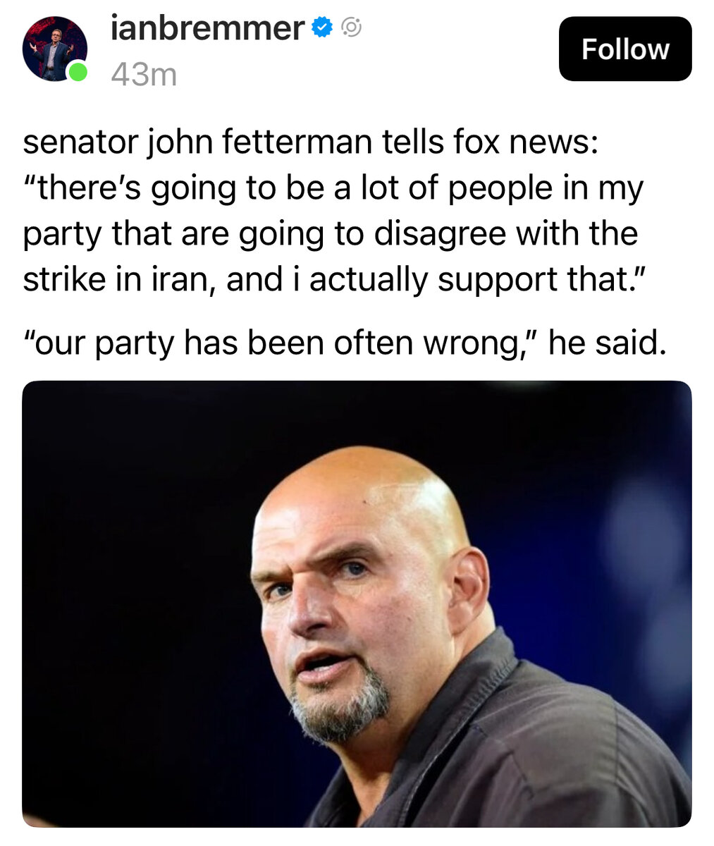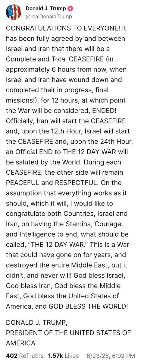 June 24Jun 24 Call me skeptical. Iranian officials met with Putin today, both sides still attacking, Israel supposedly going full assault.But hey, we will just turn it off in 4 hours.
