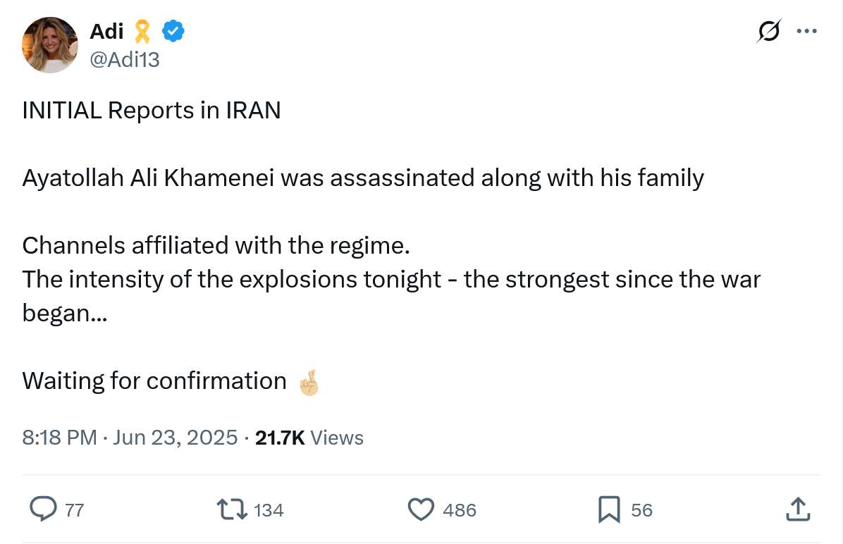 June 24Jun 24 Author This is popping up on social media - but I wouldn't get my hopes up just yet. Khamenei has been reported dead countless times before through the years.