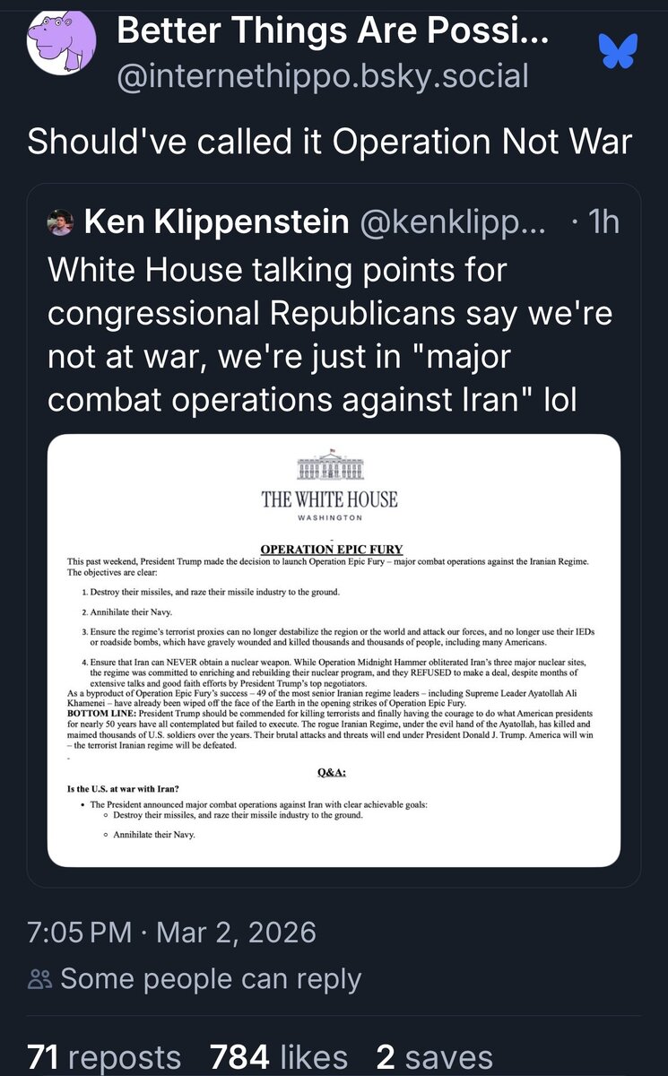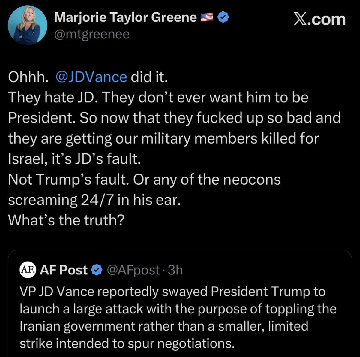 March 3Mar 3 57 minutes ago, jsdarkstar said:I don't know what's worse, the Pedophile President not being able to say NO to Bibi or the current line of propaganda coming from Congress now trying to say that we preemptively attacked Iran. What crap.So now Israel tells us when we go to war? So much for America first.For the 2nd time in less than a year no less. Don't ask me, ask the right wing manosphere.