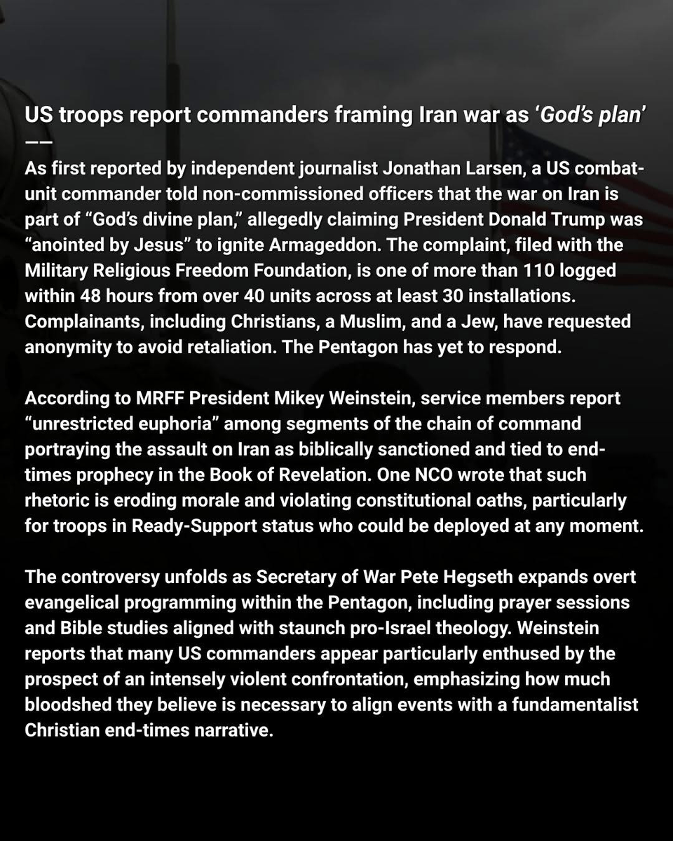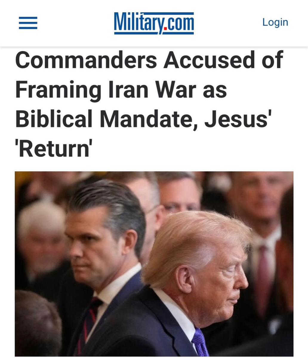 March 4Mar 4 Military.comCommanders Accused of Framing Iran War as Biblical Mandat...More than 100 complaints were made by military officers between Monday and Tuesday, totaling over 200 in total across every installation.