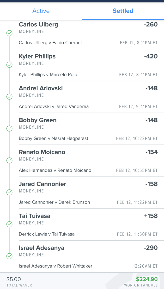 February 12, 20223 yr ADESANYA TUIVASA CANNONIER MOICANO GREEN Preliminary card (ESPN2 / ESPN+) PHILLIPS ULBERG Who I got tonight