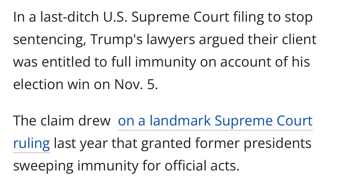 January 10Jan 10 Dave - It obviously had no impact or the sentencing wouldn’t have proceeded. They had months to halt things and they didn’t. The NY courts rejected all of Trumps appeals and those all came after the SCOTUS ruling on immunity which occurred months ago. The immunity ruling had zero impact on the NY case other than giving Trump one more angle for appeal which ultimately resulted in nothing.