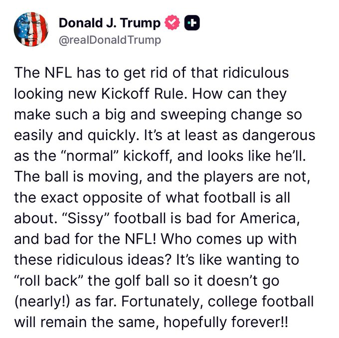 September 15Sep 15 2 hours ago, The_Omega said:This is exactly what I voted forYes if there’s someone who’s football opinions we should listen to, it’s the guy who’s actions helped lead to the collapse of the USFL….The new kickoff rule is great. Kickoffs are now part of the game again. They had become a wasted play with the overwhelming majority of them going for touchbacks. There was no point to the play. Yeah let’s go get in formation and watch the kicker boot it out of the endzone. What’s the point?