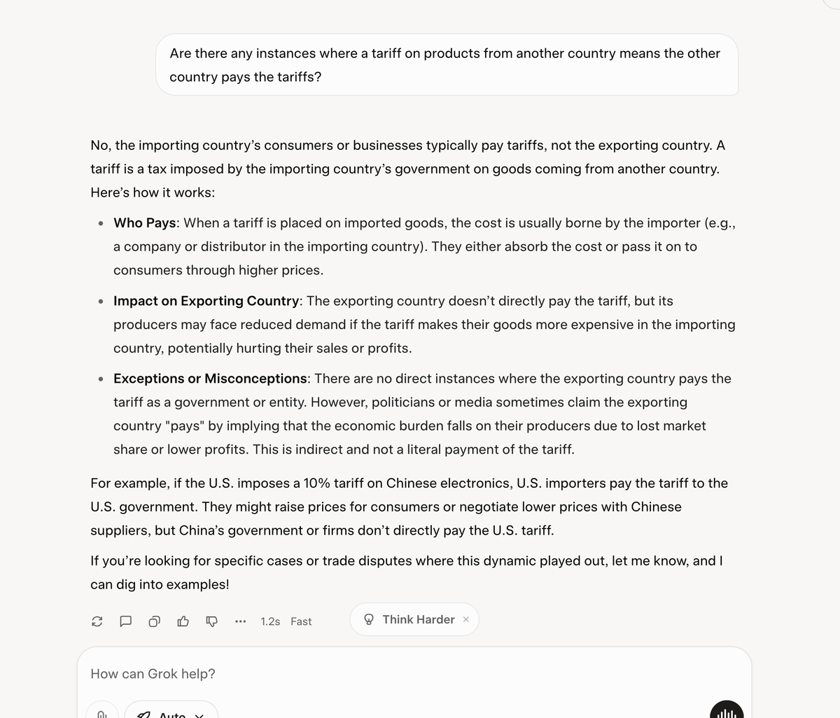 Friday at 06:46 PM2 days 13 minutes ago, Diehardfan said:You’re right, foreign countries don’t directly pay tariffs U.S. importers are the ones who pay Customs, and that cash goes straight to the government. But when you say foreign producers lowering prices means they’re not "paying” anything, that’s too narrow.When Chinese companies cut prices to stay competitive they are taking a hit on their profits to keep sales up and keep their market share as I bolded. That's money out of their pockets even if it's not a direct tariff payment. We still get the full tariff revenue, but acting like they never feel the cost misses how they have to eat pat of it.I never said they weren't paying "anything". I said they weren't paying tariffs.If we move to the indirect model you are preaching then we need to look at what happens in reality and not theory. Grok says "Foreign absorption is rarer", i.e. there are likely to be some examples of foreign producers lowering their costs but they will be rare. To date, it seems US companies have taken the hit to some extent which won't last.
