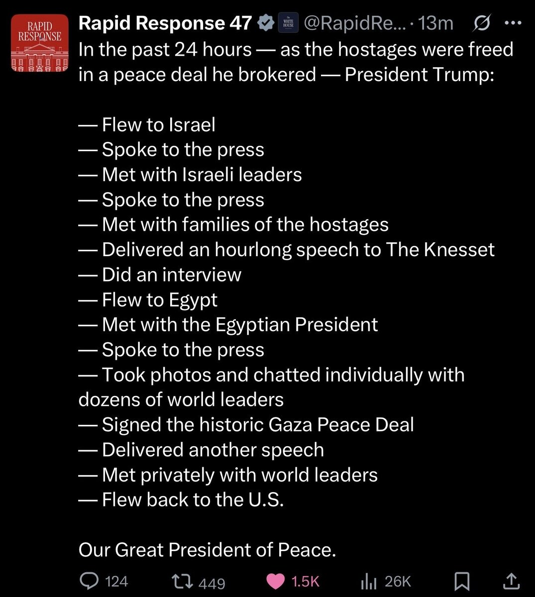 15 hours ago15 hr 48 minutes ago, It Hurts said:WOW: President Trump just landed back at the White House at 3AM after his historic trip to Israel and Egypt.He made it just in time for Charlie Kirk’s birthday and the Medal of Freedom ceremony.No sleep. No slowdown. Just results.The man’s work ethic is unmatched. 🇺🇸