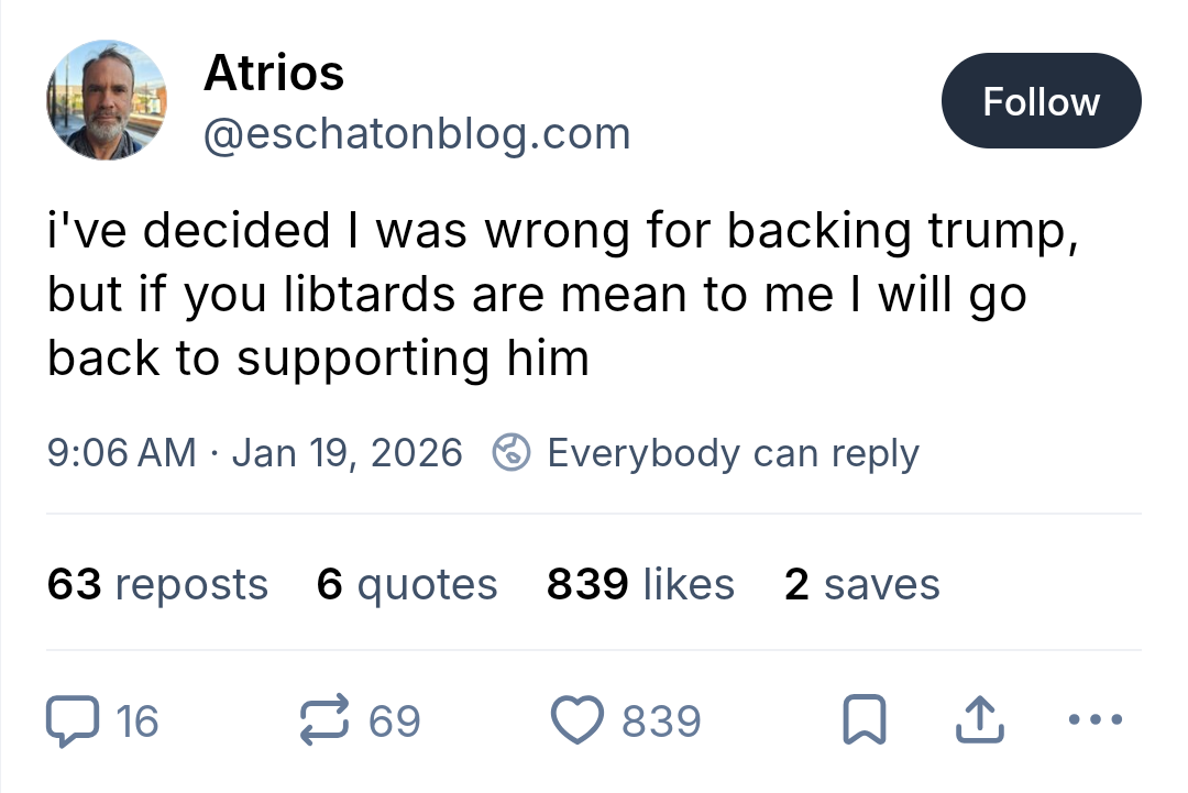 January 19Jan 19 39 minutes ago, mayanh8 said:I know you'll find some sort of fence sitting answer but I have to ask... what do you call a Trump voter who hasn't quit Trump after him leading a pedophile ring, who is about to go to war with NATO allies, and has done nothing to make good on any election promise other than immigration?I kind of feel like that's the definition of MAGA?If you mean a Trump voter that now basically sits silent feeling bad but lets everything happen without saying anything then I wouldn't call that MAGA. I call that a bunch of cowards. If you mean someone who continues to say "this is what I voted for and wants more" than yeah that's MAGA. Don't you see both of those types around in your life somewhere?
