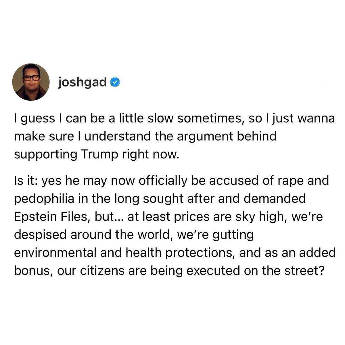 February 4Feb 4 "sure, Trump might be senile and corrupt, masked government agents might be roaming the streets like brownshirts intimidating and escalating encounters with legal citizens of the nation, and China's trade surplus might be larger than ever.. but at least the democrats aren't in charge." -a moron