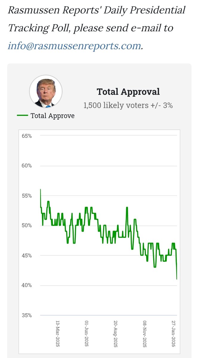 February 5Feb 5 With a 41% approval rating, Trump is now below his lowest 1st term approval and at an all time high "strong disapproval".And keep in mind this is Rassmussen, the MAGA shill pollster...