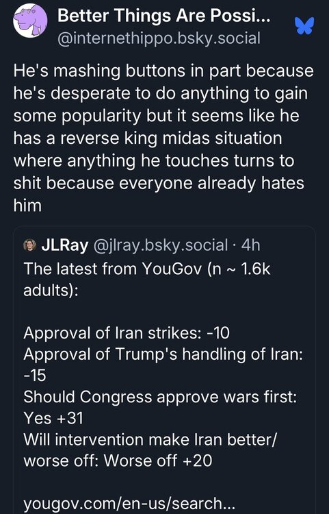 3 hours ago3 hr 15 minutes ago, Gannan said:My wife thinks we will have midterms, and a new president in 2028. I hope she's right. But if not yeah an escape plan is necessary. She doesn't think people will put up with it. She might be right. People made a stand after Alex Pretti, and Trump had to back down. That's been the one positive so far.He's going to try for sure and he can go in any number of directions or possibly several at once. Whether he succeeds or not is the question. Note: I find the most plausible scenario includes having the midterms but then challenging the validity of the results.