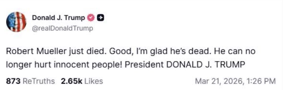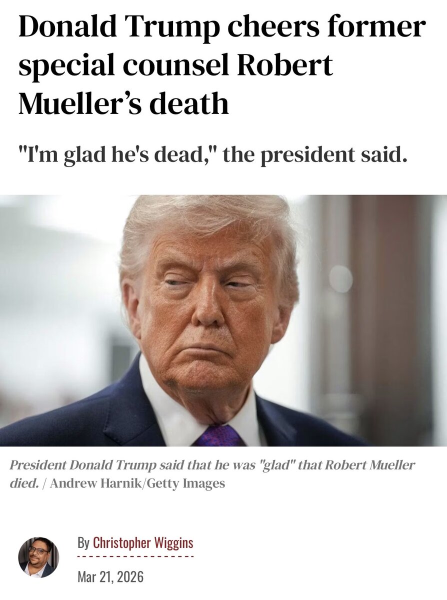 March 22Mar 22 6 hours ago, Dave Moss said:RIP to Bob Mueller, a great public servantRobert Mueller was a true American hero who fought in the Vietnam War. Had multiple decorations and was wounded in combat. The exact opposite is that POS sitting in the WH. No matter how low this clown goes, his cult followers are with him all the way. Says a lot about who they are and what they believe in. And one even puts out BS about wanting to just get along and be friends in the blog?! You’re some kind of stupid and most likely a POS just like your orange clown.