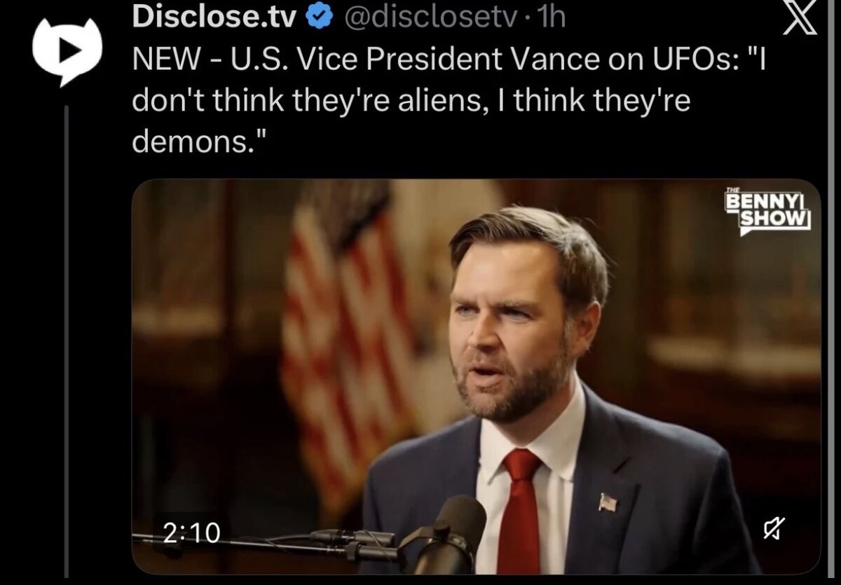 Saturday at 08:01 PM3 days 20 minutes ago, Talkingbirds said:Coming soon JD Vance as the demon hunter in remake of Tale from the Crypt’s : Demon Knight, Captain of Space Force.The new Maga talking point to deflect from the No Kings Rally. Another Christian Nationalist belief in their made up religion.