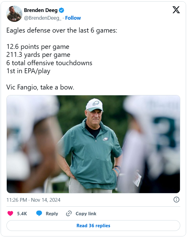Posted November 17, 2024Nov 17 Number One Posted: November 17th, 2024 | Author: Tommy Lawlor Jayden Daniels, meet Vic Fangio. And Jalen Carter and Zack Baun and Quinyon Mitchell. The electric rookie quarterback looked powerless against the surging Eagles defense on Thursday night. After the win over Washington, the Eagles have the number one defense in the NFL in terms of yards allowed. The Eagles haven’t finished a season number one since Gang Green back in 1991. Heck, I don’t know the last time the Eagles were number one in the middle of a season. We’ve seen a lot of good defenses since 1991, but being #1 is special. It will be fun to see if the guys can keep it up. One of the complaints some people had is that the Eagles hadn’t played many good offenses. Washington is a Top 5 scoring team even after the Eagles loss. They had scored 27 or more points in 6 of the 10 games leading up to Thursday night. Washington had all their OL back. They had RB Brian Robinson back. What they didn’t have was an answer for how to solve the Eagles defense. This was a short week so Fangio didn’t put together a complex gameplan. He figured out something that he thought would work against the Commanders offense and then relied on his players to execute it. The Eagles have a good enough back six/seven that they can trust those guys to cover well. By playing zone, defenders kept their eyes on the offense and could see if Daniels tried to run. Man coverage can leave you vulnerable to QB runs (something the Eagles offense is good at exploiting). The Eagles pass rush posted 3 sacks, but was regularly disruptive. Between the outstanding coverage and the effective pass rush, Daniels didn’t look comfortable very often. He threw a lot of short passes, mainly to TEs and RBs. His WRs had 28 yards for the game. That’s insane. Even crazier, Reed Blankenship caught the same number of passes from Daniels that Terry McLaurin did…one. Yikes. This defense isn’t getting lucky. This isn’t a fluke. Fangio has a sound scheme. He’s been around long enough that he has a good feel for what will work against the offense the Eagles are facing. The real magic has been in player development. Zack Baun played 660 snaps on defense in his four years with the Saints. He has played 584 defensive snaps this season and is playing at an All-Pro level. Nakobe Dean is playing the best football of his young career. Nolan Smith has taken a big step forward this year. Rookies Quinyon Mitchell and Cooper DeJean are playing like stars. Fangio and his staff are getting the most out of their players. The Ravens will be a huge test in a couple of weeks. That is a dynamic offense with a ton of weapons. That could be a matchup of the #1 offense and the #1 defense, which would be really cool. I was happy when the Eagles hired Vic Fangio. I was hoping for a Top 10 defense, which would pair with an explosive offense and help the Eagles get back to playing good football. The defense playing at such a high level has helped the Eagles win 6 games in a row and elevate itself to being one of the top teams in the league. ***** Not every game has been a blowout during the winning streak, but you can see the Eagles are dominating the yardage battle. If not for some fluke plays, the final scores would look better. There was the blocked FG in CLE, the fumble/non-fumble vs JAX and allowing the garbage time TD to WAS. If the Eagles can clean some things up, this team could really start to open some eyes. ***** The Eagles run game has been amazing this year. 1st in Attempts 2nd in Yards 1st in TDs 4th in Yards per Attempt They have run for at least 113 yards in every game. They have run for 144 or more yards in 8 of 10 games. They did that 6 times last year and 5 times in 2022. I think we can call that the Saquon Barkley effect. D’Andre Swift and Miles Sanders played well the past couple of years, but Barkley is on another level. His combination of speed and strength makes him a special player. It also helps that Kenny Gainwell and Jalen Hurts have run better since the bye week. Gainwell has had a run of 10 or more yards in 5 of the 6 games. Hurts has run for 9 TDs in that span and has a run of 12 or more yards in 4 of the 6 games. http://igglesblitz.com/2024/11/number-one/