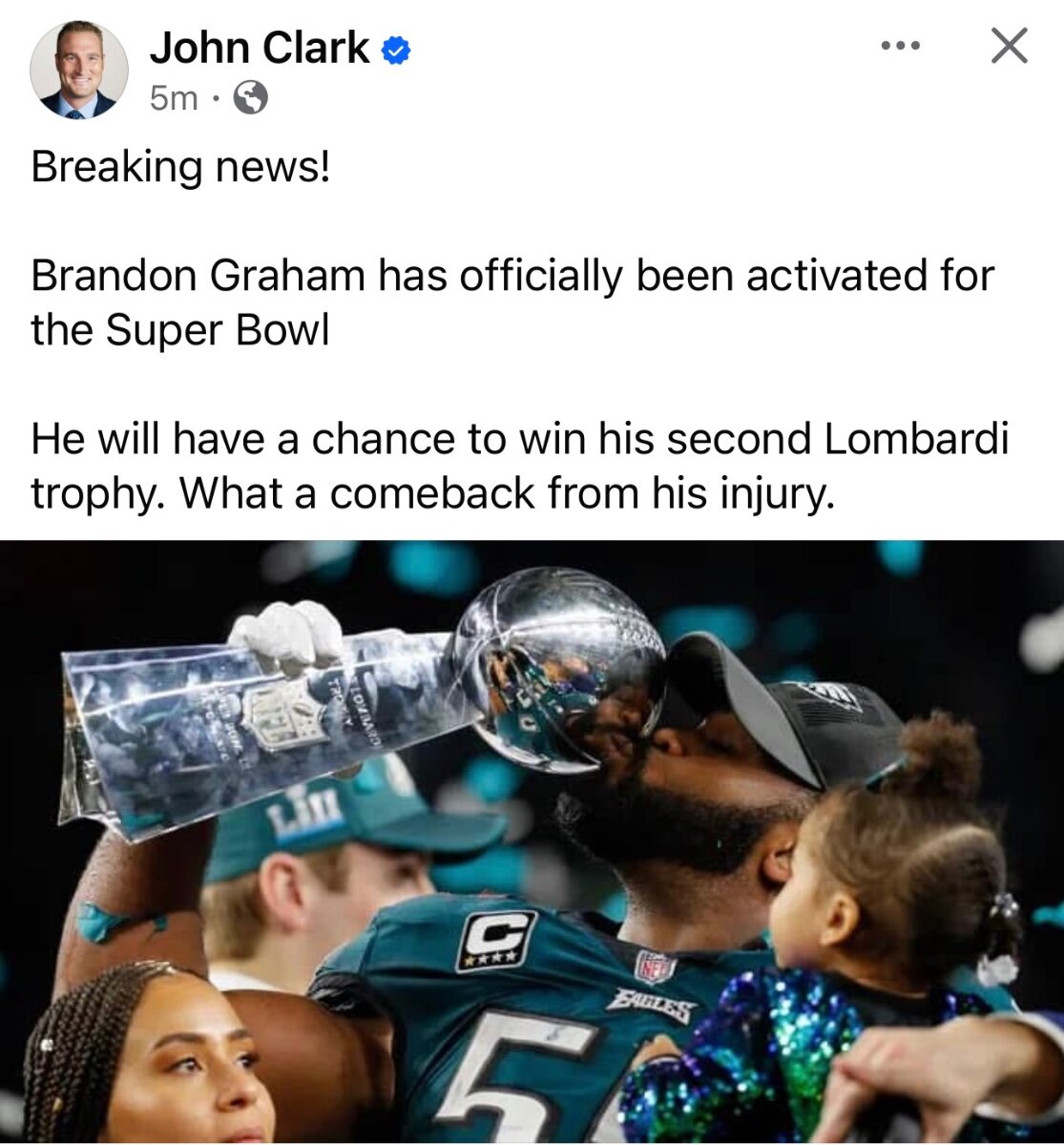 January 29Jan 29 Would be inspirational if he plays. Regardless, think he will give an epic pregame speech to a team that wants revenge. Eagles should come out on fire. We have been leading most of the time in the playoffs so that will be key once again.