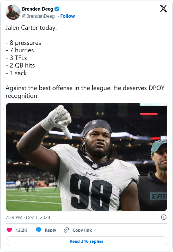 December 2, 2024Dec 2 The eagles are already becoming a nightmare matchup for any team, but if they ever figure out how to score early, their running game will continue to grind teams down and put the game away early in the 2nd half. I still think Sirianni is scripting the first 10-15 plays and that is what causes the lack of production.......it seems too obvious to me that the offense starts rolling after Moore is making the calls.