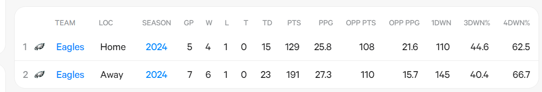 December 3, 2024Dec 3 I only care about the 1 seed for the first round bye, I don't care about HFA. I say this because the Eagles don't seem to be bothered by road games this season. Here are their home and away splits, pretty close (keep in mind that the game in Brazil was considered a home game even though it was technically not a home game since it was on a neutral field): So if we adjust the above for the fake home game they're 7-1 on the road and 3-1 at home. I really wish they didn't add a 7 seed, the #2 seed having a bye as well was super nice.