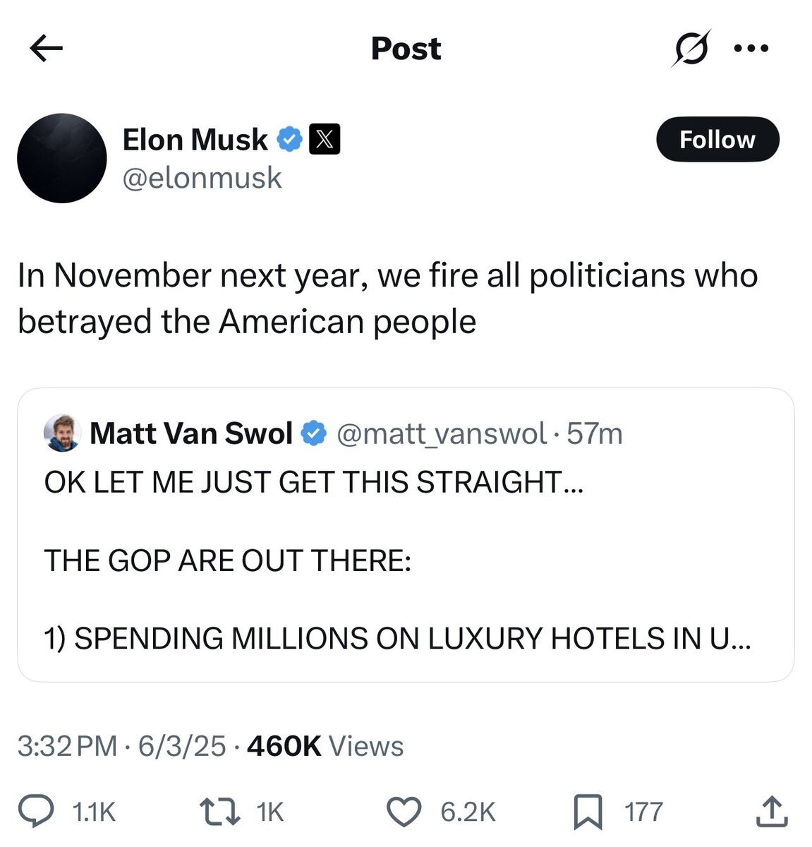 June 4, 2025Jun 4 It took him two months to reveal some major sources of corruption and give clear advice on how to end the national debt.Because of this he received multiple death threats, withstood acts of terrorism, and, for a few weeks, actually became a fake NSDAP.The good news is the sheep can go back to sucking Elon’s **** again. Your masters no longer order you to call him a NSDAP.