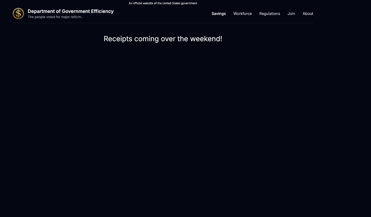 February 17Feb 17 Is anyone else surprised that the Department of Government Efficiency has missed their self-imposed deadline for receipts TWICE I fully expect the final edit to be "Receipts coming soon"