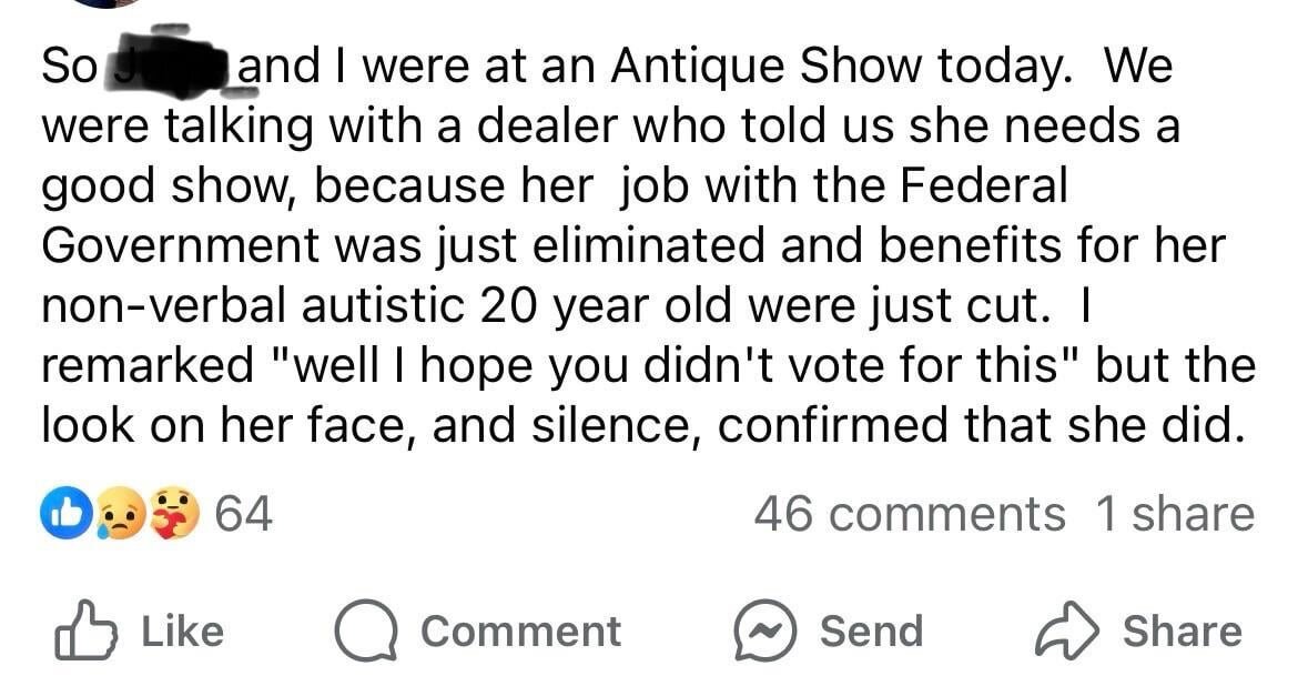 February 17Feb 17 20 minutes ago, Alpha_TATEr said: im all for cutting government waste and lord knows there is a ton of it, but to cut for the sake of cutting is not a good strategy. i just feel bad for the people who voted to lose their jobs, just to own the libs. it's a human tragedy. Why feel bad for them? Trump vilified federal workers throughout his campaign. Instead of being strategic by understanding what each department does and coming up with metrics to identify under performing workers he just fires a bunch of people. I only feel bad for federal workers that didn’t vote for him and people also losing much needed benefits as a result of these cuts.